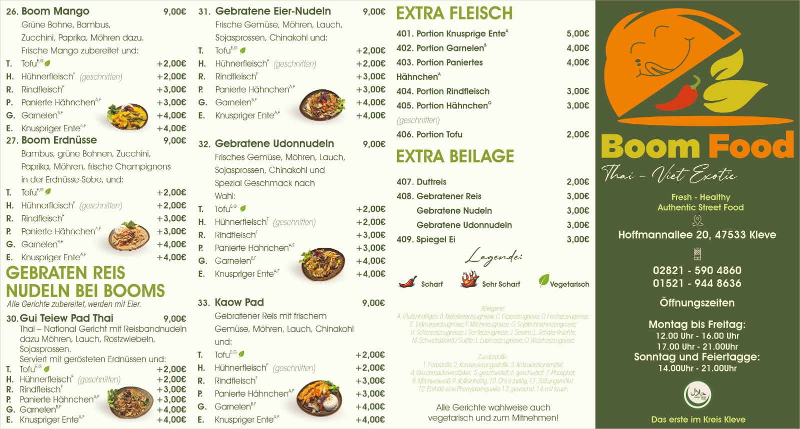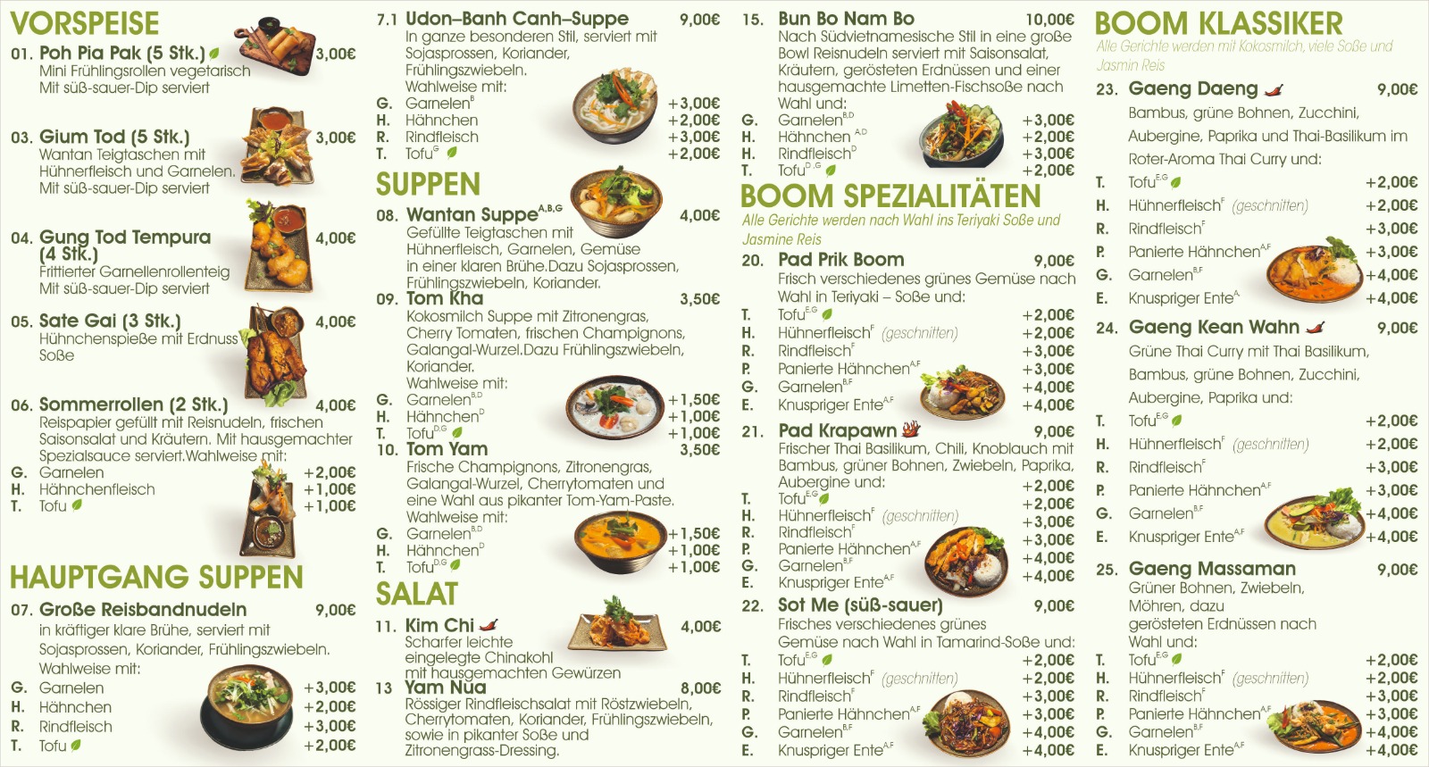 Unsere Getränkekarte im Boomfood Thai-Viet-Exotic bietet eine breite Auswahl an erfrischenden und exotischen Getränken, die perfekt zu unseren Gerichten aus Südostasien passen. Probieren Sie unsere beliebte Thai-Eistee, frische Limonade oder einen erfrischenden Saft aus asiatischen Früchten. Wir haben auch eine Auswahl an Bier und Wein, um Ihre Mahlzeit abzurunden. Alle unsere Getränke werden mit frischen Zutaten zubereitet und sorgen für ein unvergessliches Geschmackserlebnis. Kommen Sie vorbei und entdecken Sie die Welt der asiatischen Getränke bei uns im Thai-Viet-Bistro!
